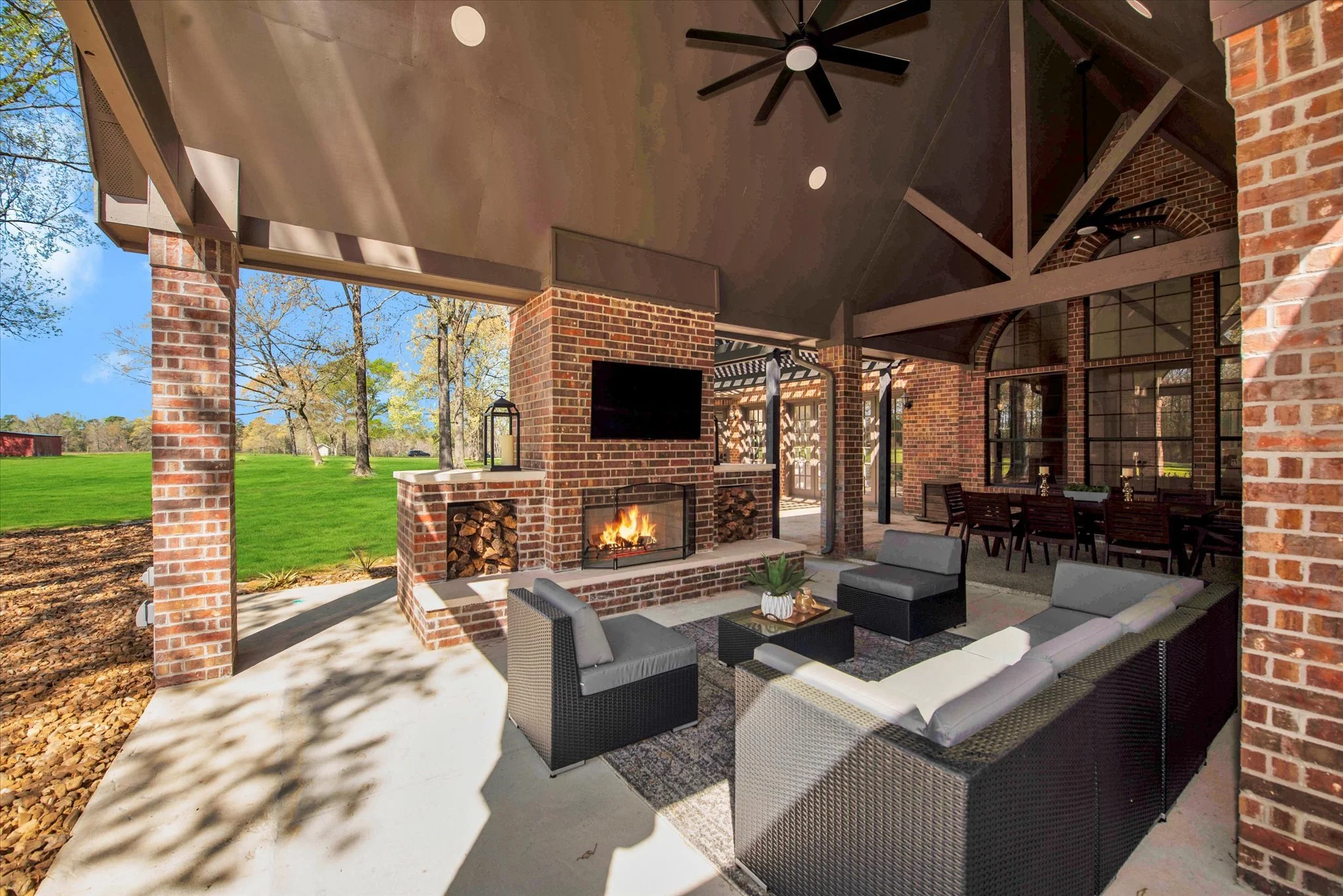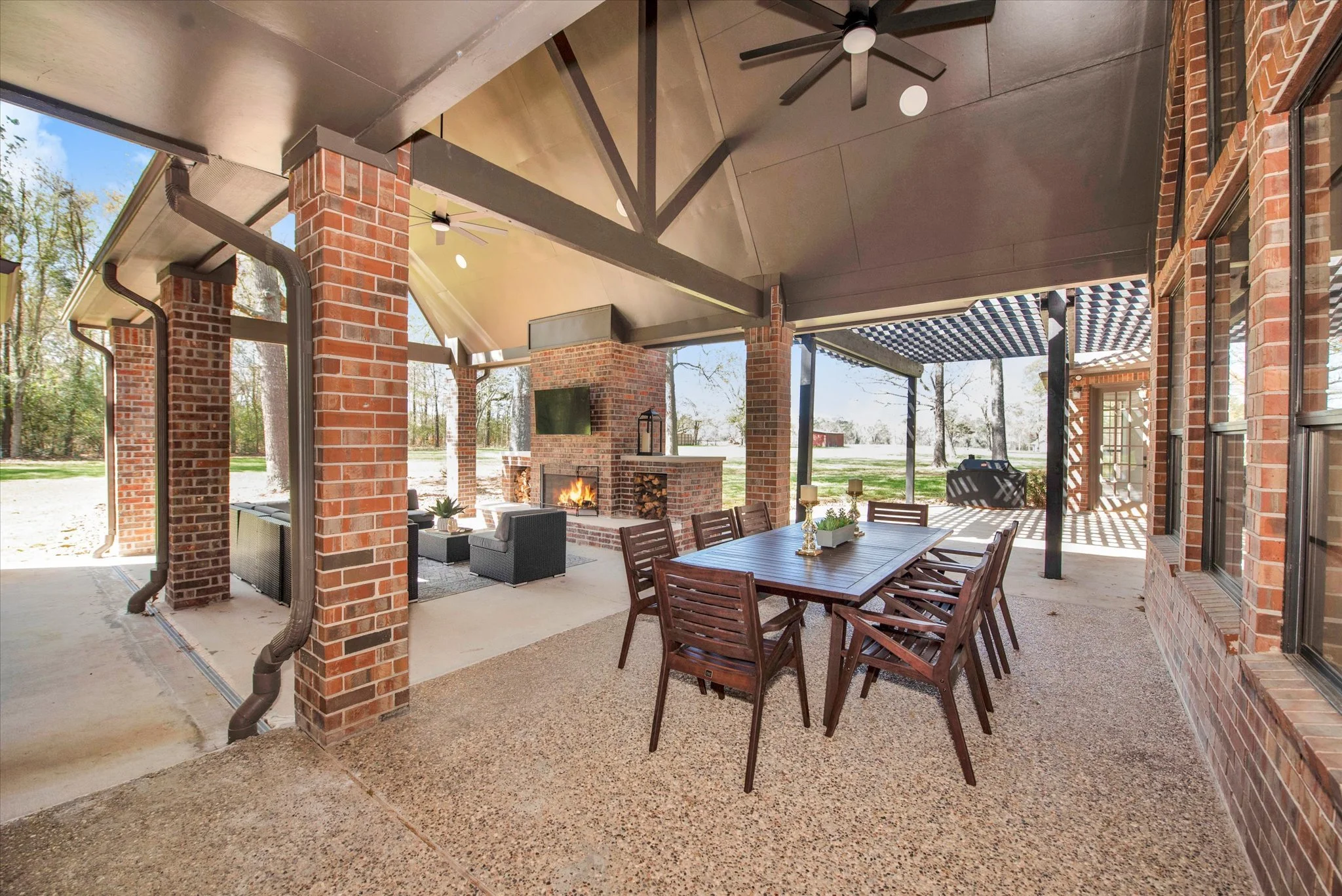 THE BEAUTY OF BEING IN THE COUNTRY IS EXPERIENCED OUTSIDE. TO HELP YOUR GROUP SOAK IT IN, THE OUTDOOR LIVING AREA CONNECTS DIRECTLY WITH KITCHEN AND PORTE COCHERE. THE WOODBURNING FIREPLACE PROVIDES WARMTH WHILE WATCHING TV OR SMOKING BRISKET ON THE OKLAHOMA JOE SMOKER/GRILL.