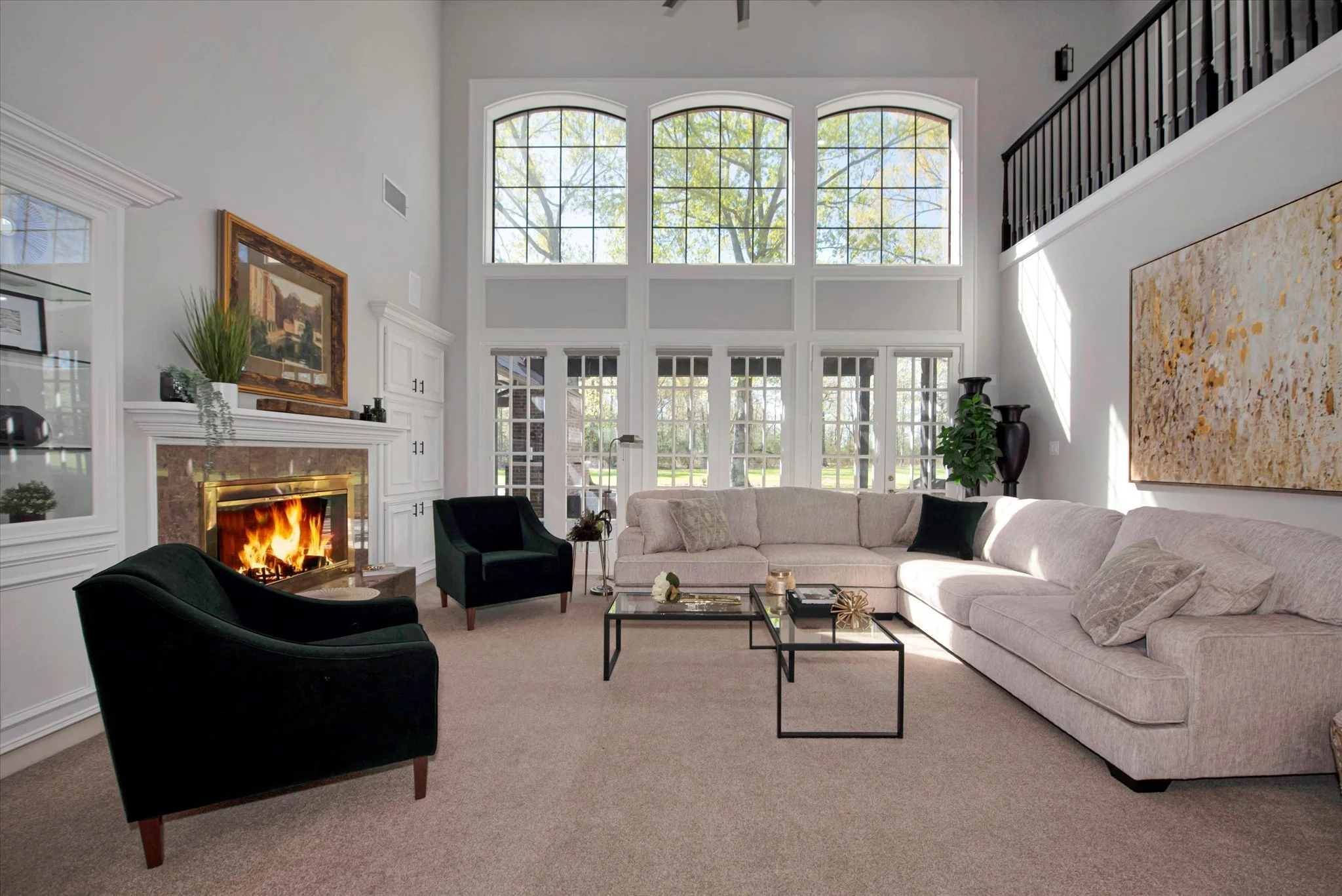 THE 2 STORY FORMAL LIVING PROVIDES AMPLE SEATING AROUND THE 2-SIDED WOOD BURNING FIREPLACE WITH A VIEW TO ONE OF THE OUTDOOR SEATING AREAS.